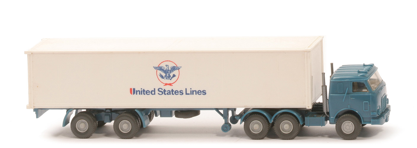 | | Zugmaschine | | Kabine | azurblau | | Kabinen-Unterteil | azurblau | | Verglasung | klar | | Inneneinrichtung | ca. hellolivgrau | | Auspuffrohre | 2, silber | | Chassis | azurblau | | Radlauf hinten | azurblau | | Sattelpfanne | für großen Königsbolzen | | Reserverad | ohne | | Räder | Profil grob | | Felgen | silbergrau | | | Container | | Art | Glattwand | | Farbe | weiß | | Türen | neu | | Beschriftung | United States Lines (s. Foto) | | Beschriftung Art | roter Kreis um Adler | | | Auflieger | | Farbe | azurblau | | Unterfahrschutz | ohne | | Königsbolzen | stark | | Räder | Profil grob | | Felgen | silbergrau |