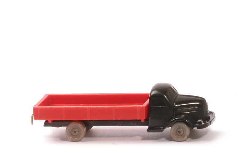 | Achsen | Drahtachser | | Farbe Kabine u. Chassis | schwarz | | Bemalung Scheinwerfer | weiß | | Bemalung Nummernschild | weiß | | Bemalung Stoßstange | ohne | | Version Chassis | mit Schlitz | | Bodenprägung | WM | | Pritsche Typ | flach | | Pritsche Farbe | orangerot | | Zapfen | mit Rundzapfen | | Pritschenfläche | glatt | | Bemalung Nummernschild hinten | weiß | | Zughaken | Draht, heiß eingelassen | | Räder | 9 mm, ohne Profil | | Farbe Räder | hell mischgrau |