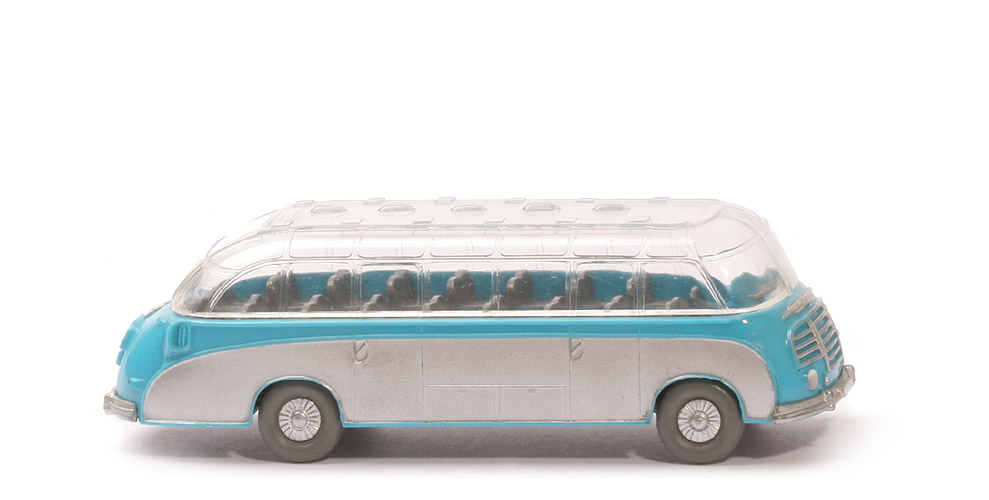 Karosserie Typ | Serie | Karosserie Farbe | (helles) dunkeladriablau | Schlitze für Dach | fast quadratisch | Armaturenbrett | rechteckig | Gestaltung Zierline Front | mit Punkt, gesilbert | Boden Fahrgastraum | glatt | Gestaltung Seite | Schablonierung silber | Fahrersitz Farbe | basaltgrau | Sitzreihen | basaltgrau, gesteckt | Fahrer | ohne Fahrer | Lenkrad Typ | groß, zwei Speichen | Lenkrad Farbe | ca. basaltgrau | Dach Befestigung | gesteckt | Dach Gestaltung oben | glatt, ohne Schablonierung | Dach Typ Haltenasen | fast quadratisch | Chassis Farbe | basaltgrau | Chassis Typ | Typ 2 | Achshalterungen hierbei | geschlossen | Bodenprägung hierbei | WM im Kreis | Bemalung Hauptscheinwerfer | silber | Bemalung Nebelscheinwerfer | silber | Bemalung Grill und Zierlinie | silber | Bemalung Stoßstangen | silber | Bemalung Rückleuchten | rot | Bemalung Blinker hinten | rot | Bemalung Kennzeichen hinten | silber | Bemalung 3 Zierlinien hinten | silber | Bemalung Lüfter | ohne | Räder Typ | Trilex Bus, ohne Profil | Räder Ausführung | staubgrau, Felgen gesilbert |