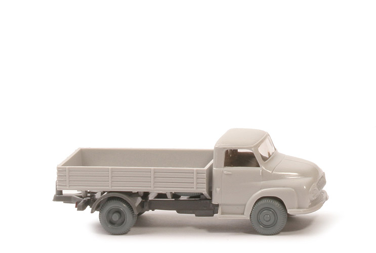 Kabine | ca. lichtgrau | Verglasung | fast klar | Inneneinrichtung | ohne | Bemalung Scheinwerfer | silber | Bemalung Grill | silber | Bemalung Kennzeichen vorne | silber | Farbe Pritsche | ca. lichtgrau | Pritscheneinlage | ohne | Chassis Typ | im Bereich der Hinterachse geschlossen | Chassis Farbe | ca. basaltgrau | Bodenprägung | neues WIKING-Logo | Bemalung Rückleuchten | rot | Bemalung Kennzeichen hinten | ohne | Reserverad | unter Pritsche | Plane | ohne | Räder | 10 mm, ca. staubgrau |