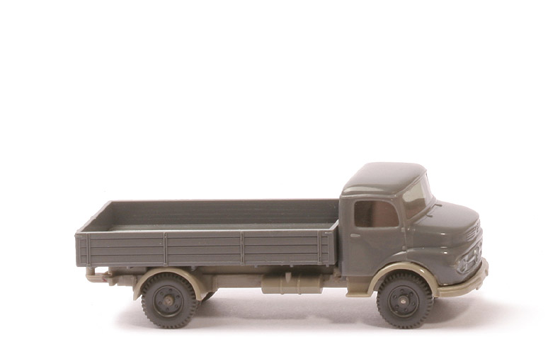 Version Kabine | ohne Dachlüfter, Stoßstange separat | Farbe Kabine | basaltgrau | Verglasung | getönt | Grill | silbern eingesetzt | Verglasung | getönt | Bemalung | ohne | Inneneinrichtung | ohne | Kombination Chassis/Pritsche | Version 4 | Chassis Art | Typ 3 (wie folgt) | Kotflügel hinten | stark | Pritschenabstützung | stegartig | Reserverad | ohne, hierfür Steg | Aufnahme für Inneneinrichtung | mit | Bodenprägungen | Wiking, 43k, Made in Germany | Chassisfarbe | olivgrau | Pritsche Art | Typ 2 (wie folgt) | Pritschenseiten | gerade, feine Struktur | Pritschenboden | 6 schmale Quertraversen | Pritsche Farbe | basaltgrau | Pritscheneinlage | silbern | Plane | ohne | Räder | 11mm, 6 Loch, Grobprofil |