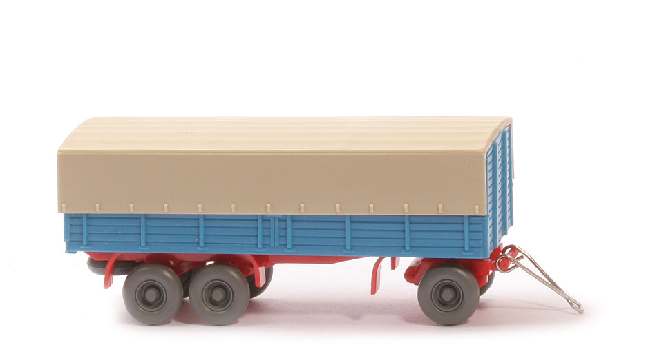 | Pritsche | Farbe | himmelblau | Rückleuchten | ohne | Herstellerkennzeichnung | WM im Kreis | | Chassis | Farbe | orangerot | Achshalterungen | geschlossen | Drehschemel | mit silberner Kappe fixiert | Deichsel | Metall | | Plane | Typ | hinten offen | Farbe | hellgelbgrau | | weitere Details | Bemalung Nummernschild | ohne | Räder Typ | 12mm, ohne Profil | Räder Farbe | ca. basaltgrau |