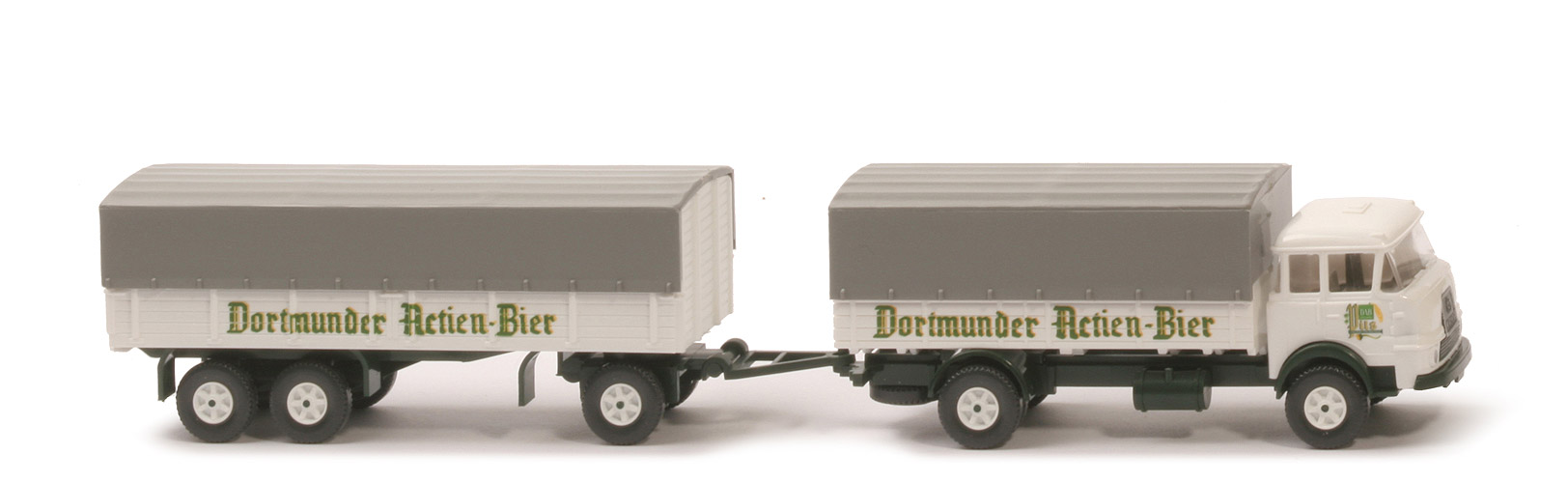| Zugwagen | Kabine | weiß | Türdruck | DAB-Logo | Grill | schwarz eingesetzt | Bedruckung Grill | Grillumrandung, Zierlinien, Logo, "Krupp" silbern | Verglasung | klar | Inneneinrichtung | ca. lichtgrau, Lkr integriert | Stoßstange | dunkles kieferngrün | Chassis | dunkles kieferngrün | Reserverad | hinten unter Chassis | Pritsche | weiß | Plane | helles staubgrau | Räder | 12 mm, Profil grob | Felgen | Trilex, weiß, Nabe zentral ~ schwarz | | Anhänger | Farbe | weiß | Rückleuchten | mit | Herstellerkennung Pritsche | neues WIKING-Logo | Chassis | dunkles kieferngrün | Herstellerkennung Chassis | neues WIKING-Logo | Achshalterungen | offen, dunkles kieferngrün | Achshalterungen Typ | trapezförmig | Drehschemel | eingesteckt | Deichsel | beweglich, angesteckt, Kunststoff dunkles kieferngrün | Plane | helles staubgrau | Reserverad | ohne | Räder | 12 mm, Profil grob | Felgen | Trilex, weiß, Nabe zentral ~ schwarz | | Bedruckung | Pritschen seitlich | "Dortmunder Actien Bier" (s. Foto) |