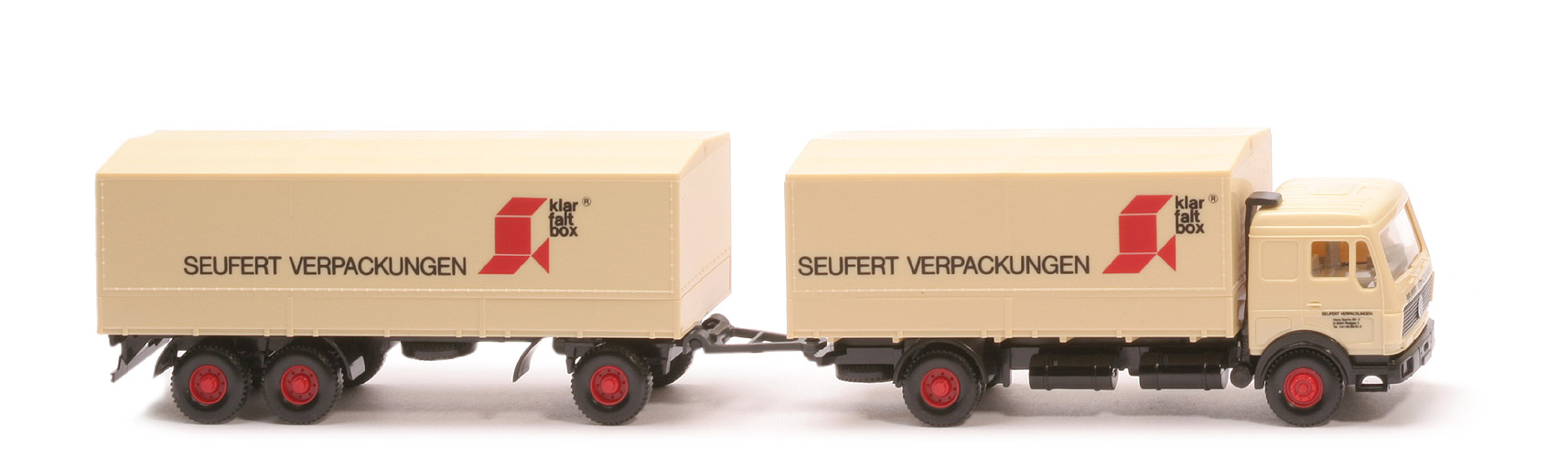 | Zugwagen | Kabine Farbe | creme | hintere Seitenfenster | geschlossen | Scheibenwischer | mit | Heckfenster | geschlossen | eingesetzter Grill | schwarz, mit MB-Stern, ohne Streifen | Inneneinrichtung | ca. silbergrau mit Lenkrad | Ansaugstutzen | schwarz, hinter Kabinenrückwand | Stoßstange | schwarz | Chassis | schwarz, BP WIKING, Berlin-W | Radlauf hinten | schwarz | Reserverad | hinten unter Chassis | Pritsche | Glattwand, creme | Plane | creme | Räder | schwarz, Profil grob | Felgen | 8-Loch, rot | | Anhänger | Chassis | schwarz | Achshalterungen | schwarz | Unterfahrschutz | mit | Reserverad | unter Chassis | Pritsche | Glattwand, creme | Plane | creme | Räder | schwarz, Profil grob | Felgen | 8-Loch, rot | | Beschriftungen | Kabine vorne | Seufert Verpackungen | Türen | Seufert Verpackungen und Adresse | Planen Seiten | Seufert Verpackungen (s. Foto) | Plane Anhänger hinten | klar falt box |