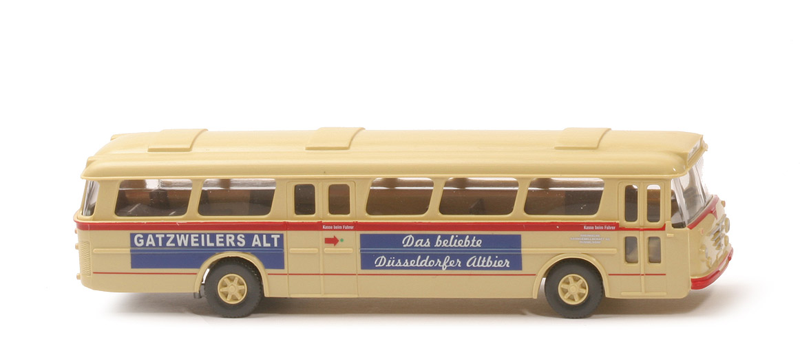 Karosserie oben | ca. grünbeige | Karosserie unten | ca. grünbeige | Verglasung | klar | Inneneinrichtung | ca. flaschengrün | Lenkrad | anthrazit | Fahrer | ohne | Schlepploch | mit | Achshalterung vorne | integriert, nach hinten offen | Bodenprägung | neues WIKING-Logo Germany, 721 | Unterflurmotor | silbern | Bemalung Hauptscheinwerfer | silbern | Bemalung Nebenscheinwerfer | silbern | Bemalung Büssing-Spinne | silbern | Bemalung Stoßstange vorne | rot | Bemalung Rücklichter | rot | Bemalung Rückstrahler | rot | Bedruckung | Gatzweilers Alt, ... | Räder Typ | 12 mm | Felgen | Trilex, ca. grünbeige |
