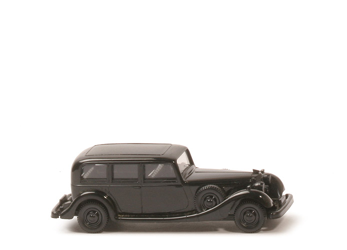 Farbe | schwarz | Grill | schwarz eingesetzt | Reserveräder | auf vorderen Kotflügeln | Inneneinrichtung | schwarz | Lenkrad | eingesetzt | Bemalung Rückleuchten | ohne | Chassisfarbe | schwarz | Bodenprägung | Horch 850, WIKING, Berlin-W | Räder | 9 mm, schwarz | Radkappen | schwarz eingesetzt |