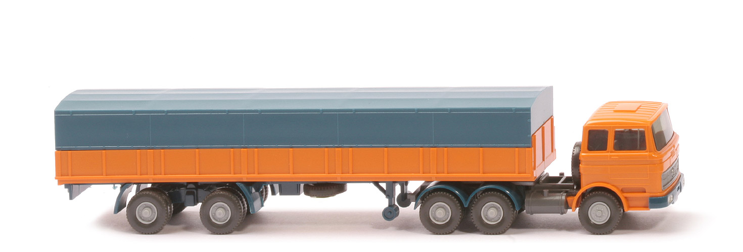 | | Zugmaschine | | Typ | Dach längsversteift | | Kabine | gelborange | | Spiegel | ohne | | Scheibenwischer | ohne | | Verglasung | getönt | | Lenkrad | ohne | | Inneneinrichtung | ca. lichtgrau | | Stoßstange | ozeanblau, Scheinwerfer gesilbert | | Chassis | basaltgrau | | Zentriernippel für Lastpritsche | ohne | | Radlauf hinten | zweiteilig ozeanblau | | Reserverad | hinter Kabine | | Sattelpfanne | für großen KöBo | | Räder | Profil grob | | Felgen | silbergrau | | | Auflieger | | Pritsche Farbe | gelborange | | Chassis Farbe | ozeanblau | | Pritscheneinlage | dünnes Papier, ca. dunkelbraunweiß | | Plane Farbe | azurblau | | Reserverad | unter Auflieger, gesteckt | | Unterfahrschutz | ohne | | Königsbolzen | stark | | Räder | Profil grob | | Felgen | silbergrau |