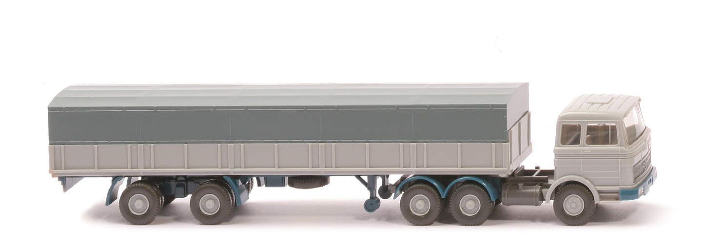 | | Zugmaschine | | Typ | Dach querversteift | | Kabine | silbergrau | | Spiegel | ohne | | Scheibenwischer | ohne | | Verglasung | klar | | Lenkrad | ohne | | Inneneinrichtung | ca. hellgelbgrau | | Stoßstange | azurblau, Scheinwerfer gesilbert | | Chassis | basaltgrau | | Zentriernippel für Pritsche | ohne | | Radlauf hinten | zweiteilig azurblau | | Reserverad | ohne | | Sattelpfanne | für großen KöBo | | Räder | Profil grob | | Felgen | silbergrau | | | Auflieger | | Pritsche Farbe | silbergrau | | Chassis Farbe | ozeanblau | | Pritscheneinlage | Pappe, silbern | | Plane Farbe | blaugrau | | Reserverad | unter Auflieger, gesteckt | | Unterfahrschutz | ohne | | Königsbolzen | stark | | Räder | Profil grob | | Felgen | silbergrau |