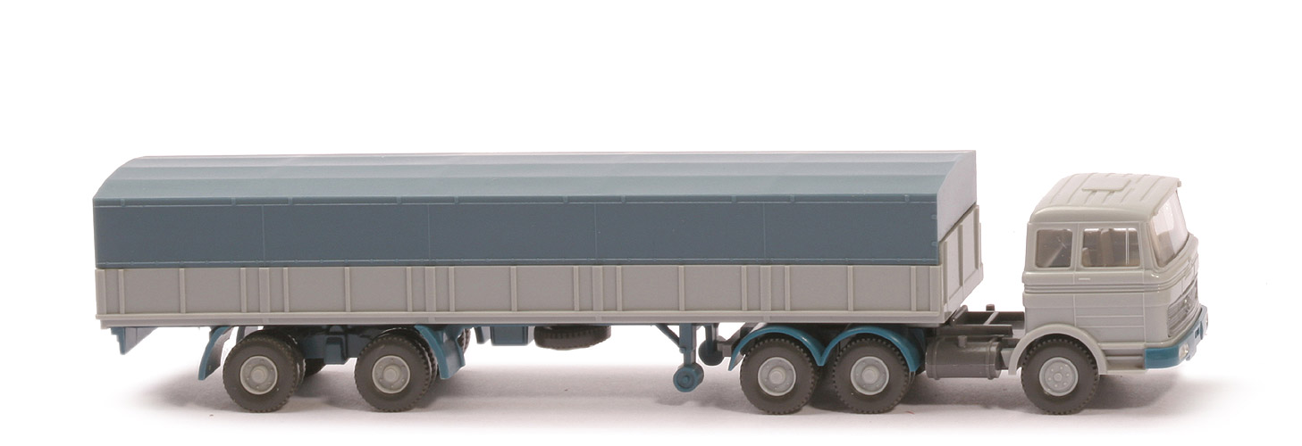 | | Zugmaschine | | Typ | Dach querversteift | | Kabine | silbergrau | | Spiegel | ohne | | Scheibenwischer | ohne | | Verglasung | klar | | Lenkrad | ohne | | Inneneinrichtung | ca. hellgelbgrau | | Stoßstange | azurblau, Scheinwerfer gesilbert | | Chassis | basaltgrau | | Zentriernippel für Pritsche | ohne | | Radlauf hinten | zweiteilig azurblau | | Reserverad | ohne | | Sattelpfanne | für großen KöBo | | Räder | Profil grob | | Felgen | silbergrau | | | Auflieger | | Pritsche Farbe | silbergrau | | Chassis Farbe | azurblau | | Pritscheneinlage | Pappe, silbern | | Plane Farbe | hellazurblau | | Reserverad | unter Auflieger, gesteckt | | Unterfahrschutz | ohne | | Königsbolzen | stark | | Räder | Profil grob | | Felgen | silbergrau |