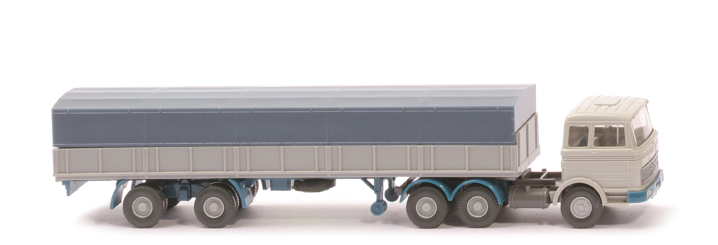 | Zugmaschine | Typ | Dach querversteift | Kabine | lichtgrau | Spiegel | ohne | Scheibenwischer | ohne | Verglasung | klar | Lenkrad | ohne | Inneneinrichtung | ca. hellgelbgrau | Stoßstange | azurblau, Scheinwerfer gesilbert | Chassis | basaltgrau | Zentriernippel für Pritsche | ohne | Radlauf hinten | zweiteilig azurblau | Reserverad | ohne | Sattelpfanne | für großen KöBo | Räder | Profil grob | Felgen | silbergrau | | Auflieger | Pritsche Farbe | silbergrau | Chassis Farbe | azurblau | Pritscheneinlage | Pappe, silbern | Plane Farbe | taubenblau | Reserverad | unter Auflieger, gesteckt | Unterfahrschutz | ohne | Königsbolzen | stark | Räder | Profil grob | Felgen | silbergrau |