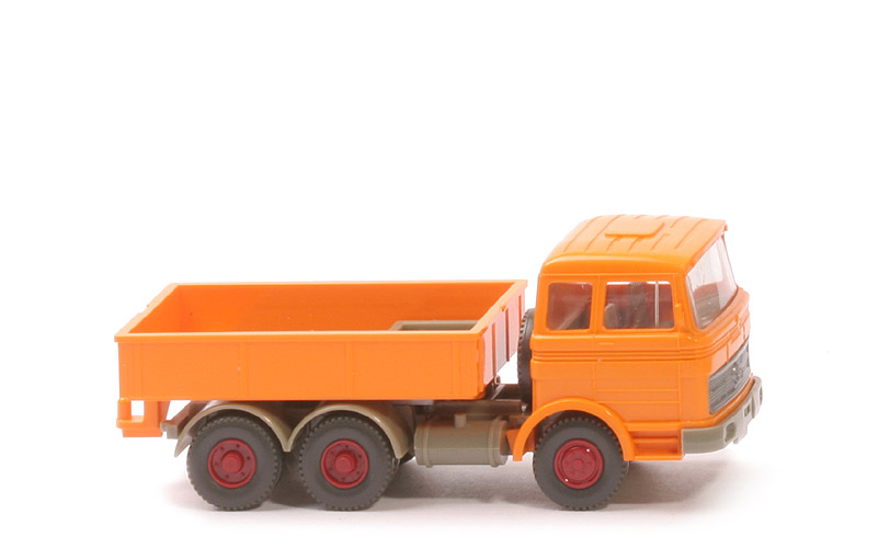 | Zugmaschine | Typ | Dach querversteift | Kabine | orangegelb | Spiegel | mit | Scheibenwischer | ohne | Verglasung | klar | Inneneinrichtung | ca. hellgraubeige, mit Lenkrad | Stoßstange | zementgrau | Chassis | zementgrau | Halterung Pritsche | mit | Radlauf hinten | zweiteilig zementgrau | Reserverad | hinter Kabine | Sattelpfanne | für großen KöBo | Pritsche Fixierung | gesteckt | Pritsche Farbe | orangegelb | Zughaken | in Pritsche integriert | Pritscheneinlage Typ | Kunststoff, mit Unterteilung | Pritscheneinlage Farbe | zementgrau | Räder | Profil grob | Felgen | hellbraunrot - 6-Loch |