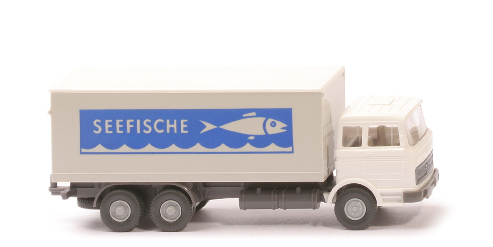 Kabine Typ | Dach querversteift | Kabine Farbe | weiß | Spiegel | mit | Scheibenwischer | ohne | Verglasung | klar | Lenkrad | mit | Inneneinrichtung | ca. hellgelbgrau | Grill | silbern eingesetzt | Stoßstange | basaltgrau | Chassis | basaltgrau | Zughaken | mit | Bemalung | ohne | Radlauf hinten | einteilig, basaltgrau | Reserverad | hinten unter Chassis | Kofferkorpus | grauweiß | Kofferdach | weiß | Ladebordwand | grauweiß | Beschriftung | Seefische ... (s. Foto) | Beschriftung Art | Negativdruck blau | Räder | Profil grob | Felgen | silbergrau |