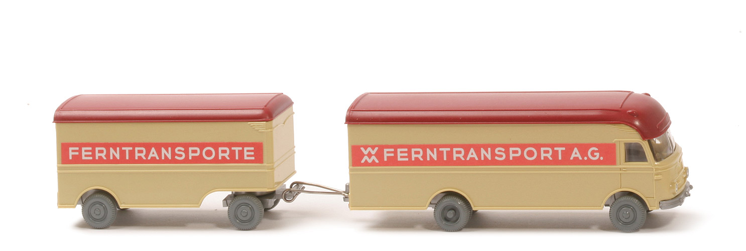 | Zugwagen | Aufbau Farbe | ca. grünbeige | Blinker vorne | mit | Verglasung | klar | Inneneinrichtung | basaltgrau | Fahrer | ohne | Kotflügel | Teil des Aufbaus | Rückleuchten | klein, rot bedruckt | Dach Farbe | ca. hellbraunrot | Dach Art | matt, mit Positionsleuchten, mit Streben | Türen | ca. grünbeige | Türen Art | Typ 3: niedrig, mit Streben, mit Griff | Chassis Art | Typ 4 | Chassis Farbe | silbern | Bodenprägung Motorblock | Punkt | Bodenprägung hinten | WIKING GERMANY | Achshalterung vorne | offen | Achshalterung hinten | offen | Fläche unter hinterem Kardan | geschlossen | Fläche hinter Hinterachse | geschlossen | Tank | mit | | Anhänger | Aufbau Farbe | ca. grünbeige | Kotflügel | Teil des Aufbaus | Dach Farbe | ca. hellbraunrot | Dach Art | matt, mit Streben | Türen | ca. grünbeige, hoch, neu | Chassis Farbe | silbern | Bodenprägung | WIKING GERMANY ohne 50a | Beschriftung | Ferntransporte ... (s. Foto) | Räder | 10 mm, ohne Muttern |