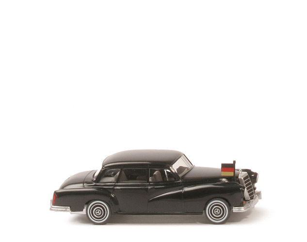Aus der Sammlerkontor-Edition "Bonner Republik". Ohne integrierten Zughaken und mit neuem WIKING-Logo. Nach originalem Vorbild gestaltet: Es handelt sich um das Modell des Dienstfahrzeuges des Bundeskanzlers Adenauer Mercedes-Benz 300d. Mit Standarte. Als Beilage gibt es selbstklebende Nummernschild-Aufkleber: " 0 - 2 ". |