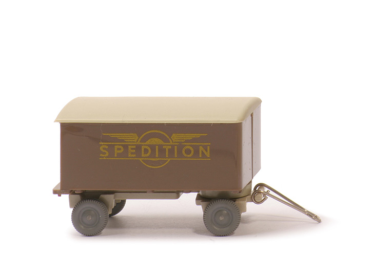 | Koffer Farbe | blassbraun | | Koffer | Typ 2a | | Rückleuchten | am Koffer | | Positionslichter vorn | ohne | | Türaufnahmen | unten geschlossen | | Türen Farbe | blassbraun | | Türen Typ | Griff als Knopf, ohne Rand | | Dach | mattiert, ohne Positionsleuchten | | Dach Farbe | hellgelbgrau | | Nummerschild | mit | | Beschriftung | Spedition im Flügelrad | | Beschriftung Art | Stempeldruck | | Chassis Typ | Version 1 | | Chassis Farbe | hellgelbgrau | | Zughaken | ohne | | Achshalterungen | geschlossen | | Drehschemel | vernietet | | Bodenprägung Drehschemel | ohne | | Bodenprägung Chassis | ohne | | Bemalung | Rückleuchten rot, Kennzeichen silbern | | Deichsel | Metall | | Räder | 10 mm, mit Profil, ältere Ausführung | | Räder Farbe | ca. staubgrau |