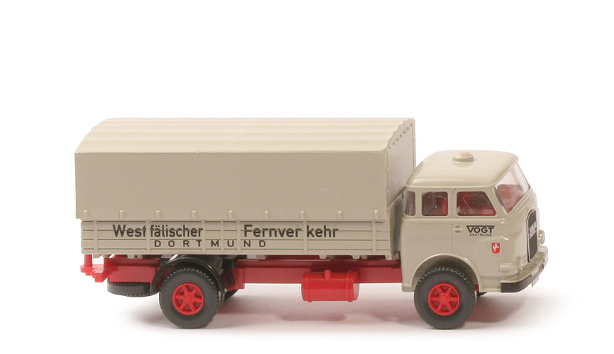 | Pritschenwagen | Fahrerhaus | hellolivgrau | Türdruck | "Vogt, Dortmund", Logo | Verglasung | klar | Inneneinrichtung | rot, Lkr integriert | Grill | schwarz, Grillumrandung, "MAN, Diesel" silbern | Scheinwerfer | silbern | Stoßstange | schwarz lackiert | Chassis | rot (recht blass und glasig) | Chassis Bodenprägung | neues WIKING-Logo | Radlauf hinten | schwarz | Pritsche | hellolivgrau | Pritsche Druck | "Westfälischer Fernverkehr, Dortmund" | Pritscheneinlage | ohne | Reserverad | unter Pritsche | Zughaken | gerade, verstärkt | Plane | hellolivgrau | Räder | 12 mm, 2-teilig | Felgen | Trilex neu, rot | | Link | altes Serienmodell | |