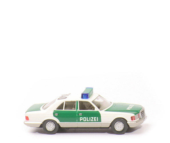 Farbe Karosserie oben | weiß | Blaulichtbalken | grün, Warnlichter blau transparent | Farbe Schürze | ca. hellelfenbein | Stoßstangen, umlaufende Leiste | silbern | Grill | schwarz, umlaufend und Lamellen gesilbert | Verglasung | klar, mit Innenspiegel | Scheinwerfer vorne | transparent | Blinker vorne | orange transparent | Rückleuchten | orange transparent | Inneneinrichtung | ca. graubeige, integriertes Lkr | Chassis | anthrazit | Bodenprägung | neues WIKING-Logo, Germany | flächige Bedruckung | Hauben, Türen grün | Bedruckung Türen und Haube | Polizei weiß | Bedruckung Dach | 340, schwarz | Räder Art | MB Radkappen | Radkappen | gesilbert |