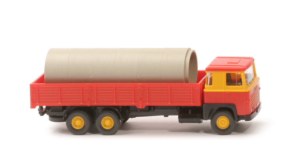 Kabinendach | rotorange | Kabine oben | "signalgelb" | Kabine unten | rotorange | Stoßstange | schwarz | Frontbeschriftung | SCANIA geprägt, gesilbert | Bedruckung Grill | waagerechte Streben "signalgelb" | Prägung Grill | mit 111, gesilbert | Scheinwerfer | an der Kabine, gesilbert | Spiegel | mit | Scheibenwischer | mit | Inneneinrichtung | anthrazit, mit Lkr integriert | Chassis | schwarz | Bodenprägung | Germany WIKING - altes Logo | Radlauf hinten | 1-teilig, schwarz | Pritsche | Hochpritsche, rotorange | Pritscheneinlage | "moosgrau" | Ladung | Betonröhrensegmente, 3x2 | Farbe | kieselgrau | Räder | 12mm, Profil grob | Felgen | 8-Loch, "signalgelb" |