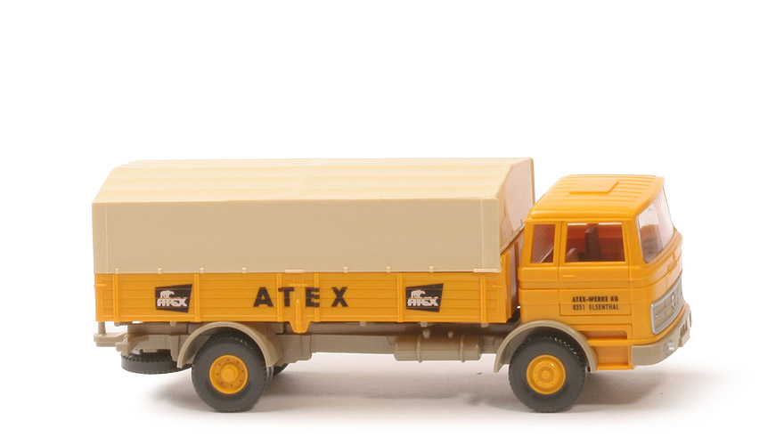 Aus dem Serien-Set "Freie Fahrt – die Kubischen kommen! - Meilensteine der WIKING-Geschichte". Türdruck "Atex-Werke KG 8351 Elsenthal", Bedruckung der Pritsche mit Atex-Logo und "Atex". Der Grill ist in Chassisfarbe gelbgrau gehalten und ist bedruckt: Umrandung, Zierlinien und Stern in silbern. Schön anzusehendes Modell! |