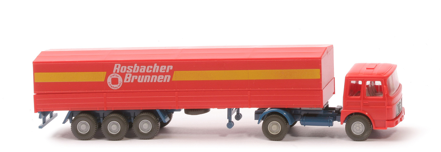 | Zugmaschine | Fahrerhaus | blassrot | Verglasung | klar | Inneneinrichtung | mit Lenkrad | Spiegel | mit | Scheibenwischer | ohne | Lüftergitter | ohne | Grill | silbern, mit Löwe | Motorblock | silbern | Chassis | capriblau | | Auflieger | Art | 4-fach-Teilung | Farbe Pritsche | blassrot | Pritsche Bodenprägung | WIKING, Berlin-W | Chassis | capriblau | Pritscheneinlage | Pappe, silbern | Plane | blassrot, ohne Innenprägung | Druck | nur: "Rosbacher Brunnen", Streifen 4mm | Stützen | als Rollen | 3-Achsaggegat Farbe | capriblau | 3-Achsaggegat Typ | Kotflügel eckig | Heck | trapezförmig | Warndreiecke | neben Rückleuchten | | Räder | Typ | 12mm, Profil grob | Felgen | silbergrau |