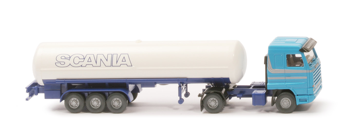 | Zugwagen | Kabine | himmelblau | Ansaugstutzen, Sonnenblende | schwarz, Sonnenblende mit Druck "Streamline" weiß | Verglasung | klar | Inneneinrichtung | ca. silbergrau, Lenkrad separat | Druck vorne | "Scania" und "143M - 500" jeweils silbern auf schwarz | Scheinwerfer | Druck silbern | Blinker | Druck orange | Stoßstange | himmelblau | Kabine unten m. Schmutzfänger | schwarz | Chassis, Kardanelement | dunkelultramarin | hier Bodenprägung | neues WIKING-Logo | Sattelpfanne | Teil des Chassis | Kotflügel hinten | schwarz | Reserverad | nicht montiert - in Tüte beigefügt | | Auflieger | Tankkorpus | weiß | Tank vorne | weiß | Tank hinten | weiß | Chassis | dunkelultramarin | Bodenprägung Chassis | WIKING Berlin-W | 3-Achsaggegat | Kotflügel rund, integriert, dunkelultramarin | Rücklichtst., Unterfahrschutz | dunkelultramarin | Hydraulikstütze | dunkelultramarin | Beschriftung Tank | "Scania" (s. Foto) | | Räder | Typ | 12mm, Felgen eingesetzt | Felgen | 8-Loch, silbern |