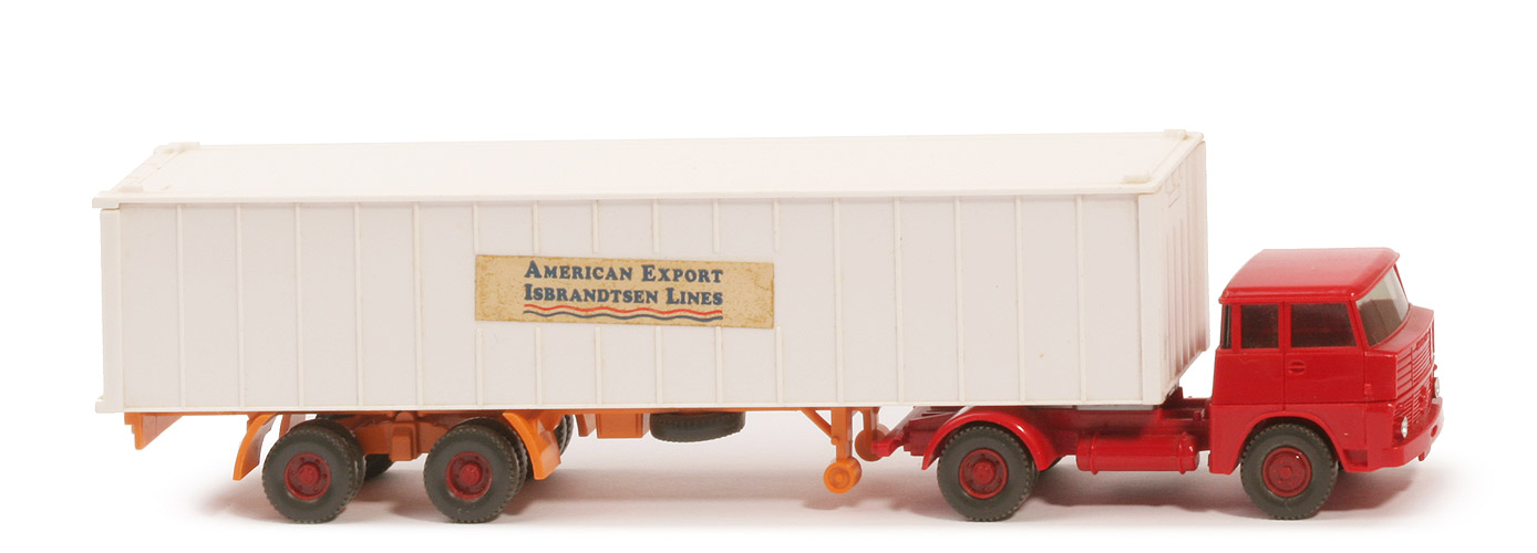 | Zugmaschine | Kabine oben | rot | Kabine unten | rot | Verglasung | getönt | Chassistyp | neu | Zughaken | ohne | Fläche hinter Sattelpfanne | 3 Stege | Chassisfarbe | rot | Sattelpfanne | für großen Königsbolzen | Reserverad | ohne | Räder | 12mm, Profil grob | Felgen | hellbraunrot | | Container | Art | 1 x 40 ft, gerippt | Dach | weiß | Korpus | weiß | Türen | weiß | Unterkante | schmal | Beschriftung | American Export ... (s. Foto) | Beschriftung Größe | 5 Felder, Papieraufkleber | | Auflieger | Farbe | gelborange (Werbe) | Unterfahrschutz | ohne | Königsbolzen | stark | Räder | 12mm, Profil grob | Felgen | hellbraunrot |