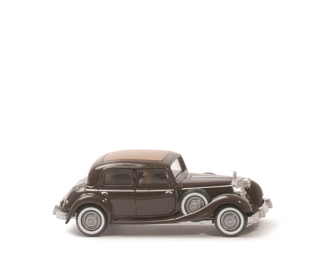 Wirklich sehr schön gestaltet: Durch Klarlacküberzug glänzt die Karosserie unvergleichlich. Es gibt sehr schöne silberne Bedruckungen der Motorhauben-Zierleiste, der seitlichen Zierleisten, der Türgriffe und der Haubenscharniere. Auf dem Heck gibt es einen fein gedruckten Mercedes-Stern. Das farblich abgesetzte Dach und die Weißwandreifen runden das Bild ab. |