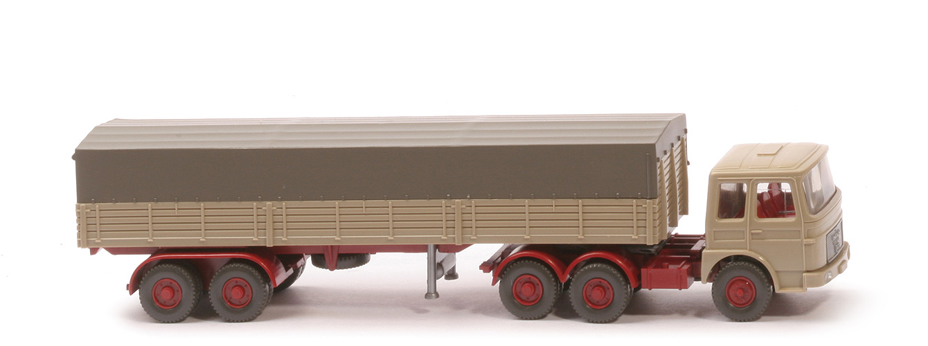 | Zugmaschine | Fahrerhaus | gelbgrau | Verglasung | klar | Inneneinrichtung | ohne Lenkrad, rot | Spiegel | keine | Scheibenwischer | keine | Lüftergitter | ohne | Grill | silbern, mit Löwe | Motorblock | silbern | Chassis | hellbraunrot | Radlauf hinten | 2-teilig, hellbraunrot | Räder | 12mm, Profil grob | Felgen | hellbraunrot | | Auflieger | Pritsche | Holzpritsche | Typ | mit Lasche | Farbe | gelbgrau | Pritscheneinlage | ca. steingrau | Chassis | hellbraunrot | Radlauf | GERMANY WIKING | Bodenprägung Chassis | WIKING | Königsbolzen | stark | Reserverad | ja | Stütze | Stempel, silbern | Plane | vorne Aussparung, ca. steingrau | Seiten | glatt, ohne 2 Stege |