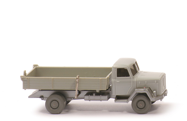 Farbe Kabine | silbergrau | Verglasung | getönt | Bemalung vorn | Scheinwerfer silbern, Blinker rot | Chassis Farbe | silbern | Chassis Art | Version 3 | hinterer Chassisbereich | geschlossen | Chassis Bodenprägung | WM | Abdeckplatte des Kipphebels | silbern | Kippscharnier | silbern | Pritsche Art | Flachbord ohne Wulst | Pritsche Farbe | silbergrau leicht vergilbt | bewegliche Heckklappe | silbergrau leicht vergilbt | Rückleuchten und Kennzeichen | an Pritsche | Bemalung hinten | Rückleuchten rot, Kennzeichen silbern | Kipphebel | auf Beifahrerseite | Räder | 11 mm, Glattwand |