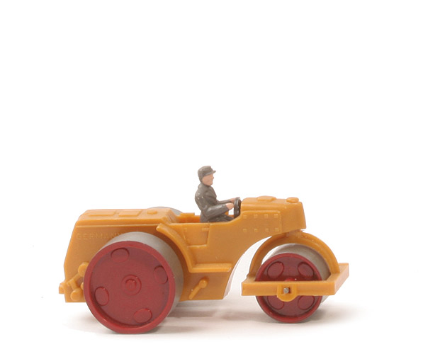 Farbe Karosserie | senfgelb | Halterung für Dach | ohne | Herstellerkennzeichnung | Prägung Heck Fahrerseite: WIKING | Herkunftskennung | Prägung Heck andere Seite: Germany | vordere Walzenhalterung Farbe | senfgelb | hier Ausführung | Achsführung verstärkt | hier Befestigung | Arretierung von oben mit kleinem Nippel | Lenkrad Farbe | anthrazit | Lenkrad Ausführung | durchbrochen | Fahrer | mit, ca. basaltgrau | Bemalung Fahrer | Gesicht, Hände | Walzen Grundfarbe | ca. weinrot | Silberung der Laufflächen | mit |