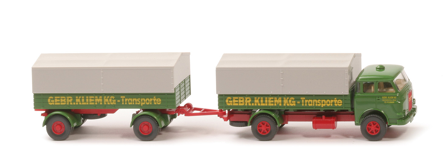 | Pritschenwagen | Fahrerhaus | dunkles maigrün | Verglasung | klar | Inneneinrichtung | ca. gelbelfenbein, Lkr integriert | Grill | rot, Rand silbern, Schriftzug gelb | Scheinwerfer | silbern | Chassis | rot | Chassis Bodenprägung | neues WIKING-Logo | Pritsche | dunkles maigrün | Pritscheneinlage | ohne | Reserverad | hinten unter Chassis | Zughaken | gerade, verstärkt | Plane | ca. lichtgrau | Räder | 12 mm, Felgen eingesetzt | Felgen | Trilex neu, rot | | Anhänger | Pritsche | resedagrün | Chassis | rot | Bodenprägung | neues WIKING-Logo, Made in Germany | Reserverad | unter Chassis | Radläufe | dunkles maigrün | Deichsel | Kunststoff, rot | Plane | ca. lichtgrau | Räder | 12 mm, Felgen eingesetzt | Felgen | Trilex neu, rot | | Bedruckung | Kabine Seite | Gebr. Kliem ... | Pritschen | Gebr. Kliem ... (siehe Foto) |