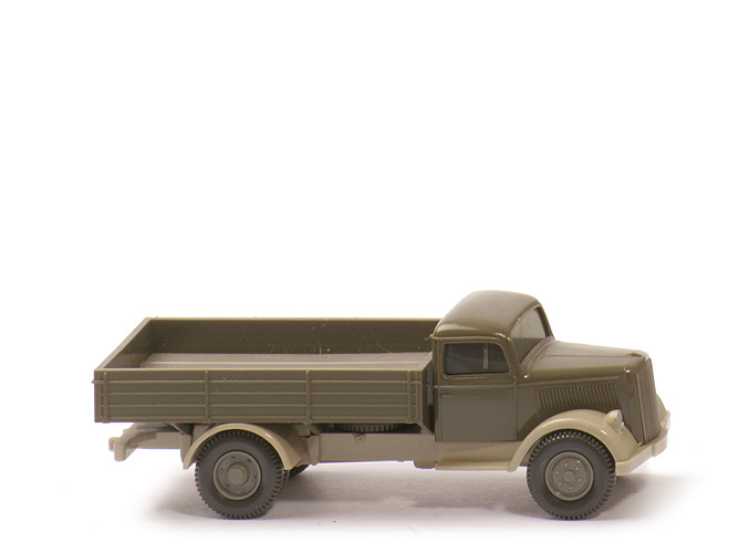 Kabine | hellolivgrün | Verglasung | getönt | Blitz auf Grill | ohne | Chassis Farbe | hellgelbgrau | Chassis Bodenprägung | WM | Zughaken | ohne | Chassis hinten | geschlossen | Reserverad | unter Pritsche mittig | Pritsche | hellolivgrün | Pritsche Bodenprägung | 335, WIKING Germany | Pritscheneinlage | hellgraubeige | Bemalung | Scheinwerfer silber | Räder | 11mm, Profil fein | Felgen | zementgrau eingesetzt | Plane | hier ohne |