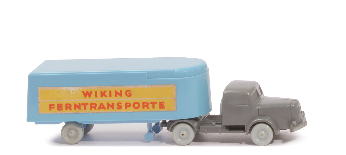 | Achsen | Rollachser | | | Zugmaschine | | Farbe Kabine | basaltgrau | | Farbe Chassis | basaltgrau | | Bemalung | Scheinwerfer, Stoßstange | | Sattelpfanne | eingesetzt, in Chassisfarbe | | Chassis | Version 1a | | Achshalterungen | geschlossen | | Bodenprägung | WM (ohne Kreis) | | Reserverad | hinter Kabine | | Räder | sog. Porzellanräder | | | Auflieger | | Farbe Oberteil | lilablau | | Farbe Unterteil | lilablau | | Radlauf | ohne Kotflügel | | Bodenprägung | WM im Kreis | | Rückleuchten | ohne | | Dach | glänzend | | Aufkleberart | Papier, matt | | Beschriftung | Ferntransporte (s. Foto) | | Beschriftung Farbe | gelb mit roter Schrift | | Räder | sog. Porzellanräder |