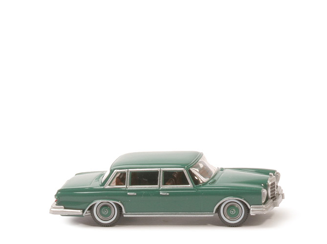Farbe | dunkles bläulichgrün Klarlack | Grill | schwarz, eingesetzt, Umrandung und Rippen silber | Scheinwerfer | klar transparent eingesetzt | Inneneinrichtung | helles lehmbraun | Hutablage | mit Rahmen | Lenkrad | separat eingesetzt | Bedruckung Seiten | Zierlinie unten, Fensterahmen, Türgriffe silbern | Bedruckung Rückleuchten | rot | Chassisfarbe | silbern (lackiert) | Bodenprägung | Mercedes 600/156/neues WIKING Logo | Bedruckung hinten | Stern und "600" auf Haube silbern ... | Räder | 9 mm, Weißwand | Radkappen | silbern, Druck dunkles bläulichgrün, Stern silber |
