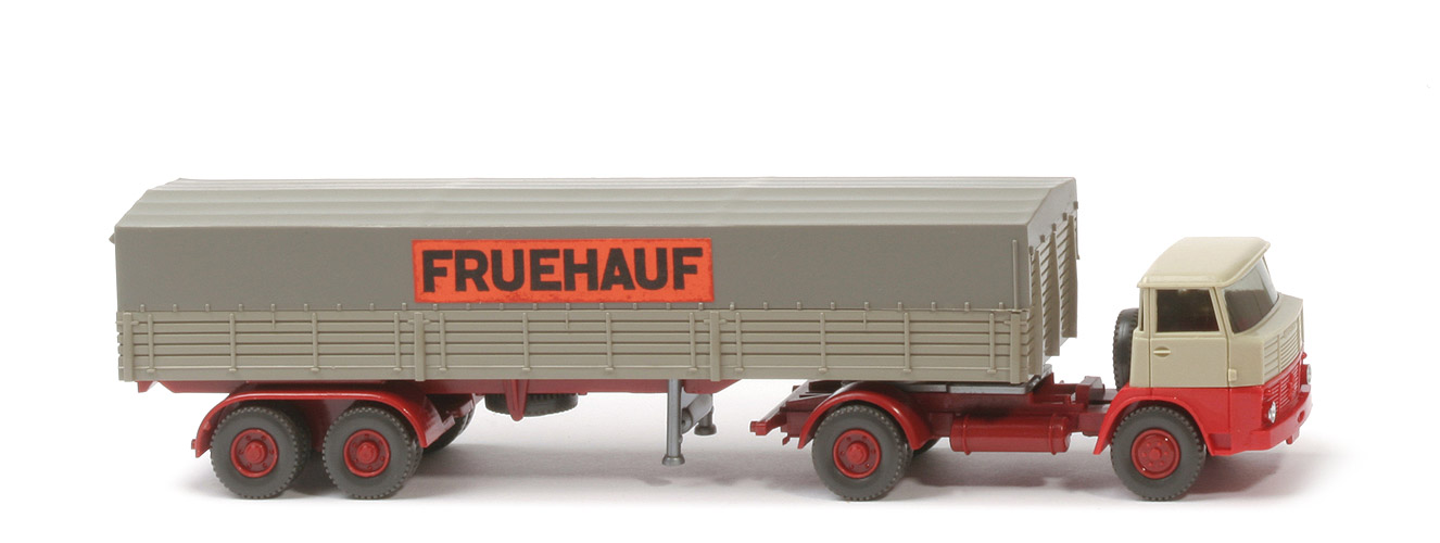 | | Zugmaschine | | Kabine oben | hellgelbgrau | | Kabine unten | rot | | Verglasung | getönt | | Chassistyp | neu | | Zughaken | ohne | | Fläche hinter Sattelpfanne | 3 Stege | | Chassisfarbe | hellbraunrot | | Sattelpfanne | für großen Königsbolzen | | Reserverad | ohne | | Räder | 12mm, Profil grob | | Felgen | hellbraunrot | | | Auflieger | | Farbe Pritsche | olivgrau | | Pritschentyp | ohne Lasche | | Chassis | hellbraunrot | | Prägung Chassis | Wiking | | Pritscheneinlage | lichtgrau | | Achseinheit | hellbraunrot | | Typ Achseinheit | Germany/Wiking | | Königsbolzen | stark | | Stütze | starr | | Plane | Seite glatt, vorne Aussp | | Plane Farbe | betongrau | | Räder | 12mm, Profil grob | | Felgen | hellbraunrot | | Beschriftung | Fruehauf, Papieraufkleber |