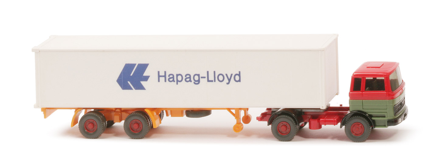 | Zugmaschine | Kabine oben | rot | Kabine unten | dunkelmaigrün | Streifen | ohne | Verglasung | getönt | Inneneinrichtung | ca. lichtgrau | Lenkrad | ohne | Grill | schwarz | Stoßstange, Radlauf vorn | schwarz | Chassistyp | neu | Chassisfarbe | rot | Radlauf hinten | schwarz | Reserverad | unter Chassis | Sattelpfanne | für großen Königsbolzen | Räder | 12mm, Profil grob | Felgen | hellbraunrot | | Container | Art | 1 x 40 ft Glattwand | Dach | weiß | Korpus | weiß | Türen | weiß | Beschriftung | Hapag-Lloyd o. Nr. (Werbe) | Beschriftung Größe | 36 mm | | Auflieger | Farbe | glasiges hellorangegelb (Werbe) | Unterfahrschutz | ohne | Königsbolzen | stark | Räder | 12mm, Profil grob | Felgen | hellbraunrot |