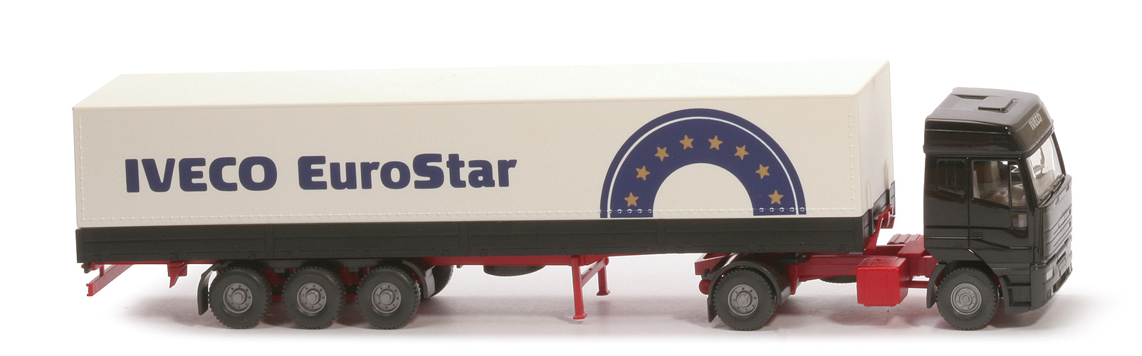 | Zugwagen | Kabine | schwarz | Kabinen-Erhöhung | schwarz, vorne Druck "Iveco" silbern | Scheibenwischer | separiert | Grill | Druck schwarz | Ansaugstutzen | schwarz | Typkennung | "IVECO", "EuroStar" silbern | Inneneinrichtung | ca. lichtgrau, Lkr separiert | Kotflügelelement | anthrazit | Scheinwerfer | gesilbert | Zusatzscheinwerfer | gesilbert | Chassis, Kardanelement | rot | Bodenprägung | neues WIKING-Logo | Seitenverkleidung | ohne | Sattelpfanne | Teil des Chassis | Kotflügel hinten | anthrazit | Reserverad | unter Chassis | | Auflieger | Pritsche | schwarz | Plane | weiß | Chassis | rot | Kotflügel, Unterfahrschutz | anthrazit | Unterfahrschutz Seiten | ohne | Stützen | rot | Beschriftung Plane Seiten | "Iveco Euro Star " (s. Foto)" | Beschriftung Pritsche Seiten | ohne | Beschriftung Pritsche hinten | ohne | | Räder | Typ | 12mm, Felgen eingesetzt | Felgen | 8-Loch, silbern |