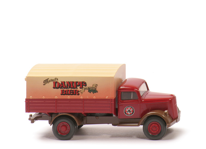 Kabine | dunkles rubinrot | Verglasung | klar | Blitz auf Grill | mit | Chassis Farbe | blassbraun | Chassis Bodenprägung | altes WIKING-Logo, neues Germany | Zughaken | integriert, klein | Chassis hinten | offen | Reserverad | unter Pritsche mittig | Pritsche | dunkles rubinrot | Pritsche Bodenprägung | 3350, WIKING Germany | Pritscheneinlage | silbern | Bedruckung Türen | Maisel-Logo | Räder | 11mm, Profil fein | Felgen | rubinrot eingesetzt, vorne 8-Loch, hinten 6-Loch | Plane | hellbeige | Bedruckung Plane | Maisels Dampfbier (s. Foto) |