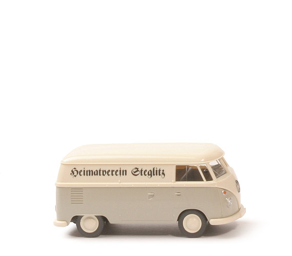 Karosserie oben | perlweiß | Bedruckung VW-Zeichen | ca. anthrazit | Bedruckung Seiten | "Heimatverein Steglitz" | Karosserie unten | ca. lichtgrau | Scheinwerfer | transparent eingesetzt, silbern hinterlegt | Bedruckung Blinker vorne | silbern bedruckt, orange bemalt | Rückleuchten | separat eingesetzt, rottransparent | Verglasung | klar | Inneneinrichtung | anthrazit, ohne Sitzreihen hinten | Lenkrad | schwarz, 2-speichig, separat eingesetzt | Stoßstangen | perlweiß, eingesteckt | Chassis Farbe | schwarz | Bodenprägung | neues WIKING-Logo | Räder | anthrazit, 8 mm, Felgen eingesetzt | Felgen | VW, Felgen, Radkappen ca. perlweiß, | | Beilage | Wappenplakette | silbern |