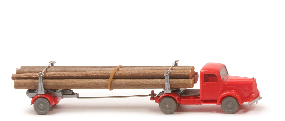 | Zugmaschine | Farbe Kabine | orangerot | Version Kabine | ohne Schlitz hinter Nrn-Schild | Farbe Chassis | orangerot | Bemalung | Scheinwerfer, Stoßstange | Sattelpfanne | alt, ohne Steg, für kleinen KöBo | Chassis | Version 2 | Achshalterungen | geschlossen | Reserverad | ohne | Räder | 10 mm, neuere Ausführung | | Auflieger | hinterer Aufbau Farbe | silbern | hinterer Aufbau Typ | für Drahtdeichsel mit BP WM | Deichsel | Draht | Rungen | silbern | Radlauf | orangerot | Achshalterungen | offen | Königszapfen | dünn, an vorderer Runge | Rückleuchten | ohne | Ladung | 7 Rundhölzer, mittelbraun | Sicherung | Metallbügel | Räder | 10 mm, ältere Ausführung |
