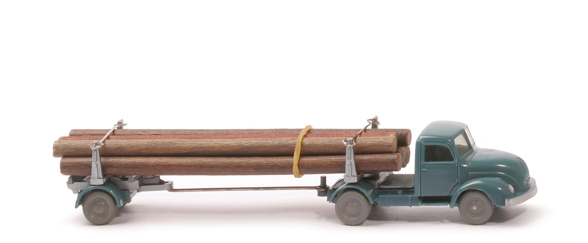 | Zugmaschine | Farbe Kabine | helles ozeanblau | Version Kabine | Typ 3 | Stoßstange | abgeschrägt | Kabinenboden | ohne Schlitz | Verglasung | getönt | Chassis Farbe | mattgraublau | Chassis Typ | Version 2 | Bemalung | Scheinwerfer, Stoßstange | Sattelpfanne | alt, ohne Steg, für kleinen KöBo | Achshalterungen | geschlossen | Bodenprägung | WM (ohne Kreis) | Reserverad | ohne | Räder | 10 mm, neuere Ausführung | | Auflieger | hinterer Aufbau Farbe | silbern | hinterer Aufbau Typ | für Drahtdeichsel mit BP WM | Deichsel | Draht | Rungen | silbern | Radlauf | mattgraublau | Achshalterungen | offen | Königszapfen | dünn, an vorderer Runge | Rückleuchten | ohne | Ladung | 7 Rundhölzer, mittelbraun | Sicherung | Metallbügel | Räder | 10 mm, ältere Ausführung |