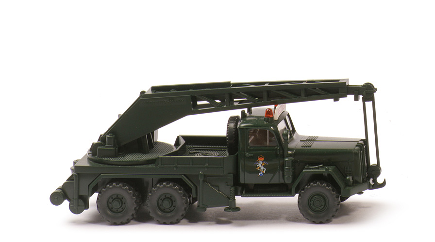 Farbe Kabine | tannengrün, auf Dach Schild "Recovery" | Verglasung | klar | Warnlichter | auf Dach verklebt, orangetransparent, oben gerundet | Dach | integrierte Kranauflage | Türdruck | Wappen | Grill | unbemalt | Scheinwerfer | gesilbert | Inneneinrichtung | anthrazit | Suchscheinwerfer | tannengrün, gesilbert | Reserverad | hinter Kabine verklebt | Aufbau Farbe | tannengrün | Drehkranz Kran | tannengrün | Kranarm Farbe | tannengrün | Kranarm Prägung | Magirus Kran, ungesilbert | Kranauszug | tannengrün | Kranhaken | tannengrün | Bedruckung Aufbau | hinten Berliner Brigaden-Logo | Stützrader | tannengrün | Chassis Farbe | tannengrün | Bedruckung Stoßstange vorne | Union Jack | Bodenprägung | neues WIKING-Logo, Germany, Magirus Kran | Bedruckung Rückleuchten | ohne | Räder | 12 mm, grobstollig | Felgen | 8-Loch, tannengrün |