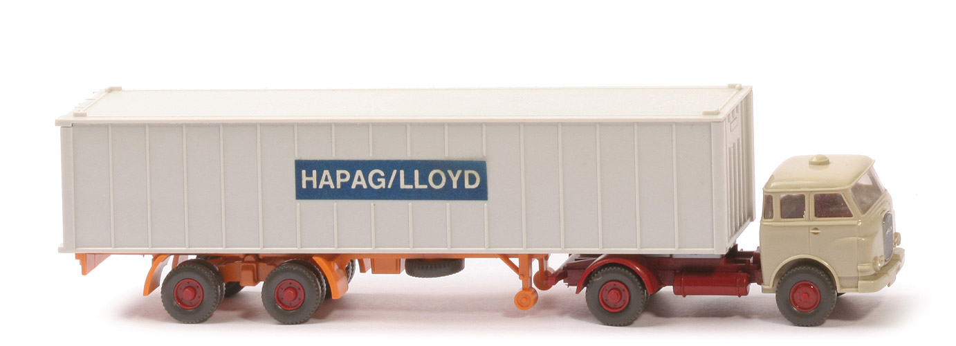 | Zugmaschine | Fahrerhaus | hellgelbgrau | Verglasung | klar | Sitze | ca. hellbraunrot | Kabinenboden | hellgelbgrau | Chassis | hellbraunrot | Sattelpfanne | für großen Königsbolzen | Fläche hinter Sattelpfanne | 3 Stege | Reserverad | ohne | Räder | Profil grob | Felgen | hellbraunrot | | Container | Typ | 1 x 40 ft, gerippt | Farbe Dach | altweiß | Farbe Korpus | altweiß | Beschriftung | Hapag-Lloyd | Beschriftung - Art | Papieraufkleber | Beschriftung - Grösse | 5 Felder | untere Kante | breit | | Auflieger | Bolzen | stark | Unterfahrschutz | ohne | Farbe | gelborange (Werbe) | Räder | Profil grob | Felgen | hellbraunrot |