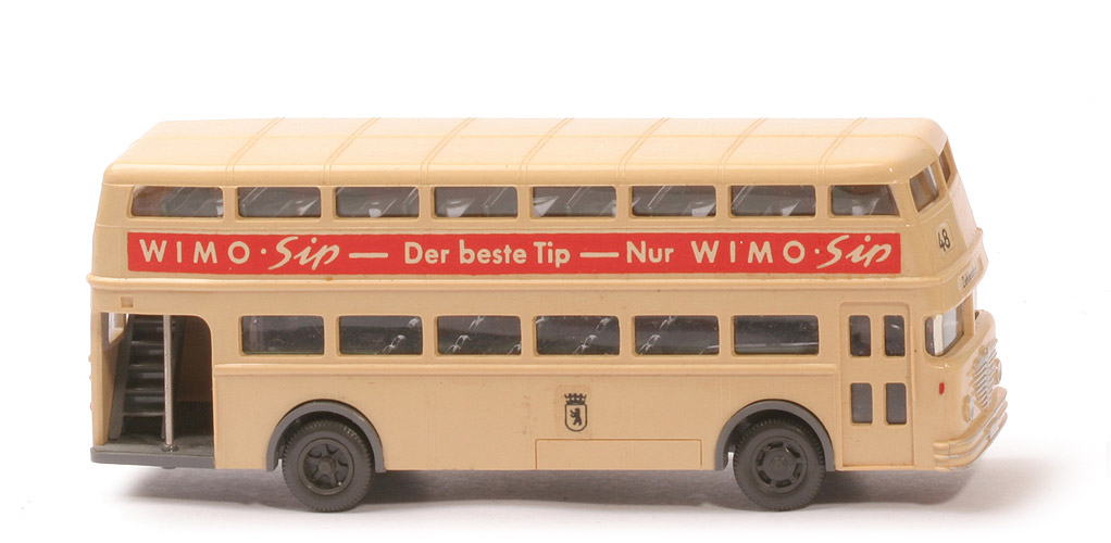 Karosserie Farbe | hellbeige | Karosserie Typ | Einstieg hinten offen | Verglasung | klar | Fahrer Farbe | ca. umbragrau | Fahrer Typ | mit Lenkrad vergossen | Fahrer Bemalung | Gesicht, Hände | Sitze Farbe | ca. grünmetallic | hintere Fahrgastraumbegrenzung | mit | Treppe hinten | mit | Chassis Farbe | staubgrau | Kardanelement Farbe | basaltgrau | Version Chassis | mit kreisrunder Verstärkung | Bodenprägung | WM | Werbebeschriftung | Wimo Sip ... (s. Foto) | Zielbeschriftung vorne | 48 Zehlendorf schwarz auf weiß | Stadtwappen | schwarz | Art der Beschriftung | Abziehbilder | Bemalung vorne | Scheinwerfer, Büssing-Spinne, Stoßstange silber | weitere Bemalung | vorne Blinker rot, 4 Rückleuchten rot | Räder Typ | 12 mm, einteilig, anthrazit | Felgen | integriert |