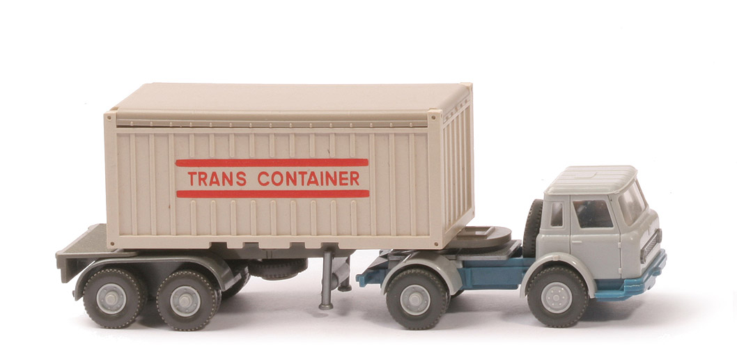 | Zugmaschine | Kabine | silbergrau | Lüfter | mit | Inneneinrichtung | azurblau | Verglasung | klar | Chassis | azurblau | Radlauf hinten | silbergrau | Sattelpfanne | für großen Königsbolzen | Reserverad | hinter Kabine | Räder | Profil grob | Felgen | silbergrau | | Container | Art | Open Top | Farbe Korpus | rotelfenbein | Farbe Dach | braunelfenbein | Beschriftung | Trans Container (s. Foto) | Beschriftung Art | Druck rot , FETT | | Auflieger | Farbe | felsgrau | Variante | mit Markierung, mit Bohrungen neben KoBo | Reserverad | unter Auflieger, gesteckt | Bodenprägung | 52h | Doppelachsaggregat Farbe | basaltgrau | Doppelachsaggregat Typ | Klemmplatte WIKING u. GERMANY | Hydraulikstützen | silbern, gesteckt | Räder | Profil grob | Felgen | silbergrau |