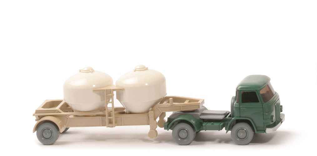 | Zugmaschine | Farbe Kabine | kieferngrün | Verglasung | stark getönt | Inneneinrichtung | ohne | Grill | integriert, ohne MAN-Emblem | Farbe Chassis | kieferngrün | Bedruckung Kabine vorn | Scheinwerfer, Kennzeichen, Stoßstange silbern | Sattelpfanne | alt, mit Steg, Neuauflage | Radlauf hinten | kieferngrün | Bodenprägung | neues WIKING-Logo | Reserverad | hinter Kabine | Räder | 10 mm, ältere Ausführung | | Auflieger | Aufbau | dunkles hellelfenbein | Herstellerkennung | neues WIKING-Logo | Leiterelement | dunkles hellelfenbein | Zementbehälter | sehr helles gelbelfenbein | Typ Zementbehälter | unten offen | Bedruckung Rückleuchten | ohne | Bedruckung Kennzeichen | ohne | Räder | 10 mm, ältere Ausführung |