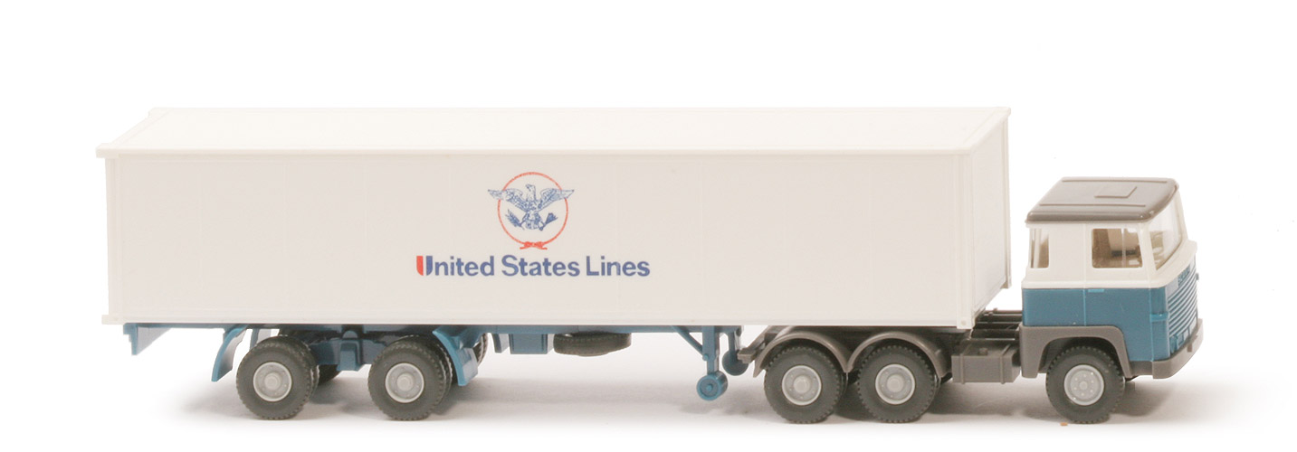 | | Zugmaschine | | Dach | basaltgrau | | Kabine oben | weiß | | Kabine unten | azurblau | | Stoßstange | basaltgrau | | Scheinwerfer | 2, ungesilbert | | Spiegel | mit | | Scheibenwischer | ohne | | Lenkrad | mit | | hinterer Radlauf | azurblau | | Sattelpfanne | für großen Königsbolzen | | Reserverad | ohne | | Chassis Farbe | azurblau | | Räder | 12mm, Profil grob | | Felgen | silbergrau | | | Container | | Art | 40 ft Glattwand | | Dach | weiß | | Korpus | weiß | | Türen | neu, weiß | | Beschriftung | United States ... (s. Foto) | | roter Kreis um Adler | mit | | | Auflieger | | Farbe | azurblau | | Unterfahrschutz | mit | | Königsbolzen | stark | | Räder | 12mm, Profil grob | | Felgen | silbergrau |