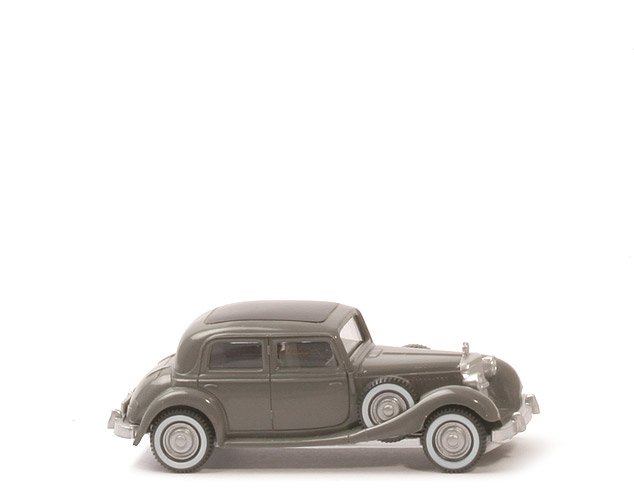 Farbe | basaltgrau | Rolldach | schwarz schabloniert | Grill | eingesetzt, silbern Lack | Struktur Grill | mit | Mercedes Stern | mit Innengravur | Reserveräder | auf vorderen Kotflügeln | Inneneinrichtung | ca. lichtgrau | Lenkrad | integriert | Bemalung Rückleuchten | ohne | Druck hinten | Stern, Haubenscharniere silbern | Chassisfarbe | silbern Lack | Bodenprägung | neues WIKING-Logo, Germany | Räder | 9 mm, Weißwand | Radkappen | silbern eingesetzt |