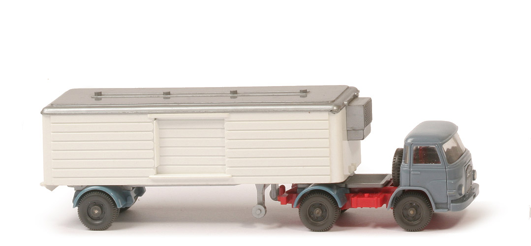 | Zugmaschine | Farbe Kabine | graublau | Verglasung | klar | Inneneinrichtung | ca. rot | Grill | silbern eingesetzt | Farbe Chassis | rot | Bemalung | Scheinwerfer | Sattelpfanne | für kleinen KöBo | Radlauf hinten | mattgraublau | Bodenprägung | WM Germany | Reserverad | hinter Kabine | Räder | 11 mm, einteilig, Profil fein | | Auflieger | Dach | silbern | Aufbau | weiß | Bodenprägung Aufbau | Wiking Modell, MiG, 52, Viking Model | Kühlaggregat | silbern | Radlauf | mattgraublau | Achshalterungen | Typ 2 | Chassis | silbern | Stützrollen | silbern | Königzapfen | integriert, mittig auf Platte | Bodenprägung Chassis | WM | Räder | 11 mm, anthrazit, Profil fein |