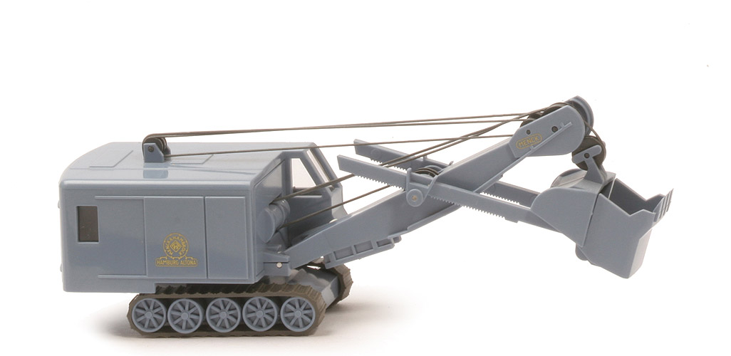 Oberwagen Oberteil | helles taubenblau | Oberwagen Unterteil | helles taubenblau | Verglasung | klar, IE basaltgrau | Unterwagen Oberteil | helles taubenblau | Unterwagen Unterteil | helles taubenblau | hier Bodenprägung | neues WIKING-Logo | Ausleger | helles taubenblau | Löffelstiele | helles taubenblau | Baggerlöffel | helles taubenblau | Laufrollen für Seilzugmechanik | anthrazit | Laufräder | 6,5 mm 8-Stern-Felge, helles taubenblau | Gummiraupen | ca. basaltgrau | Verseilung | Gummi staubgrau | Beschriftung Oberwagen Seite | "Menck-Hambrock, Hamburg Altona", gold | Beschriftung Oberwagen Heck | "Menck", gold | weitere Beschriftung Oberwagen | ohne | Beschriftung Ausleger | "Menck", gold |